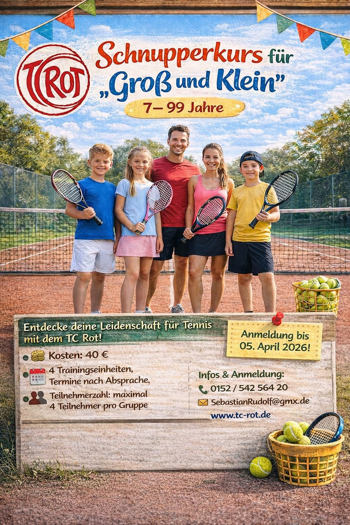 Der TC Rot lädt alle Tennisbegeisterten herzlich zu unserem Schnupperkurs ein. Egal ob Anfänger oder Fortgeschrittene, bei uns ist jeder willkommen! Der Kurs startet am Montag, den 28.04. und geht bis Sonntag, den 25.05. Jede Woche bieten wir eine einstündige Trainingseinheit an.